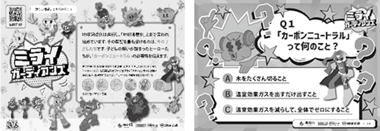 授業の中で学生が企画した環境教育プロジェクト「カーボンニュートラル教育ミライガーディアンズ」が7月に始動。市内小学生にクイズラリーやワークショップを行い、子どもたちから募った原画を元に、学生が環境問題に立ち向かうヒーローを創りました。