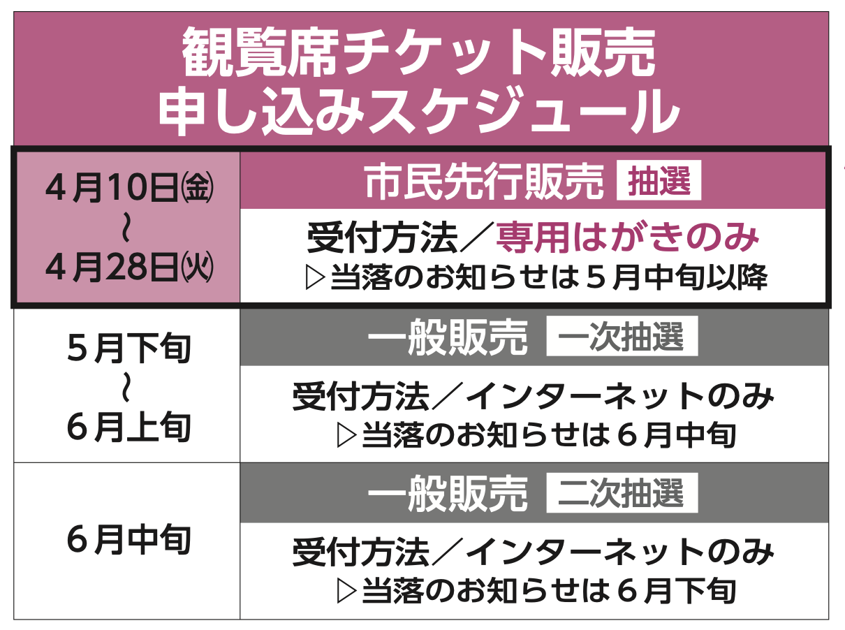 これまで実施していた一般販売後の「インターネット販売(先着)」は行いません。残席が出た場合は「一般販売(二次抽選)」を実施。全ての販売方法が“抽選”となります。