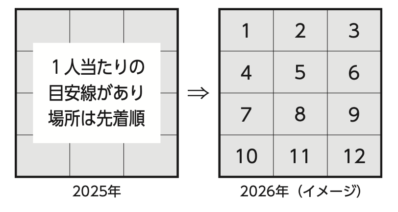先着順を無くすことで待機列を減らし、熱中症リスクを軽減します。三尺玉ブロック指定席やフェニックス観1人当たりの目安線があり場所は先着順覧席の一部はイス席にします。