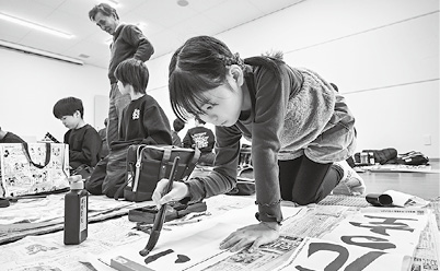 越路地域の交流施設「ここらて」で書き初め教室を行いました。講師から文字のバランスなどのアドバイスを受けた児童たち。それぞれが真剣な表情で紙に向かい、力作を書き上げました。