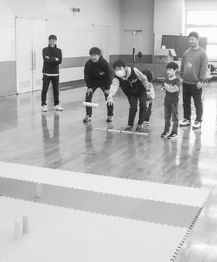 山古志体育館でモルック大会を開催しました。子どもも大人も真剣勝負の9チーム総当たり戦。的にうまく当たるたびに会場から歓声が上がりました。
