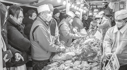 寺泊地域の魚の市場通りで、年末恒例の早朝売り出しが行われました。夜明け前から新鮮な海の幸を求める人で大にぎわい。正月の食卓を思い浮かべながら、熱心に品定めしていました。