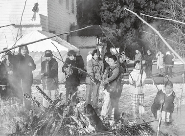 三島地域の鳥越地区で行われた「さいの神」。わらに火を付けると勢いよく炎が立ち上ります。子どもたちは竹竿につるしたスルメをあぶり、1年の無病息災を願いました。