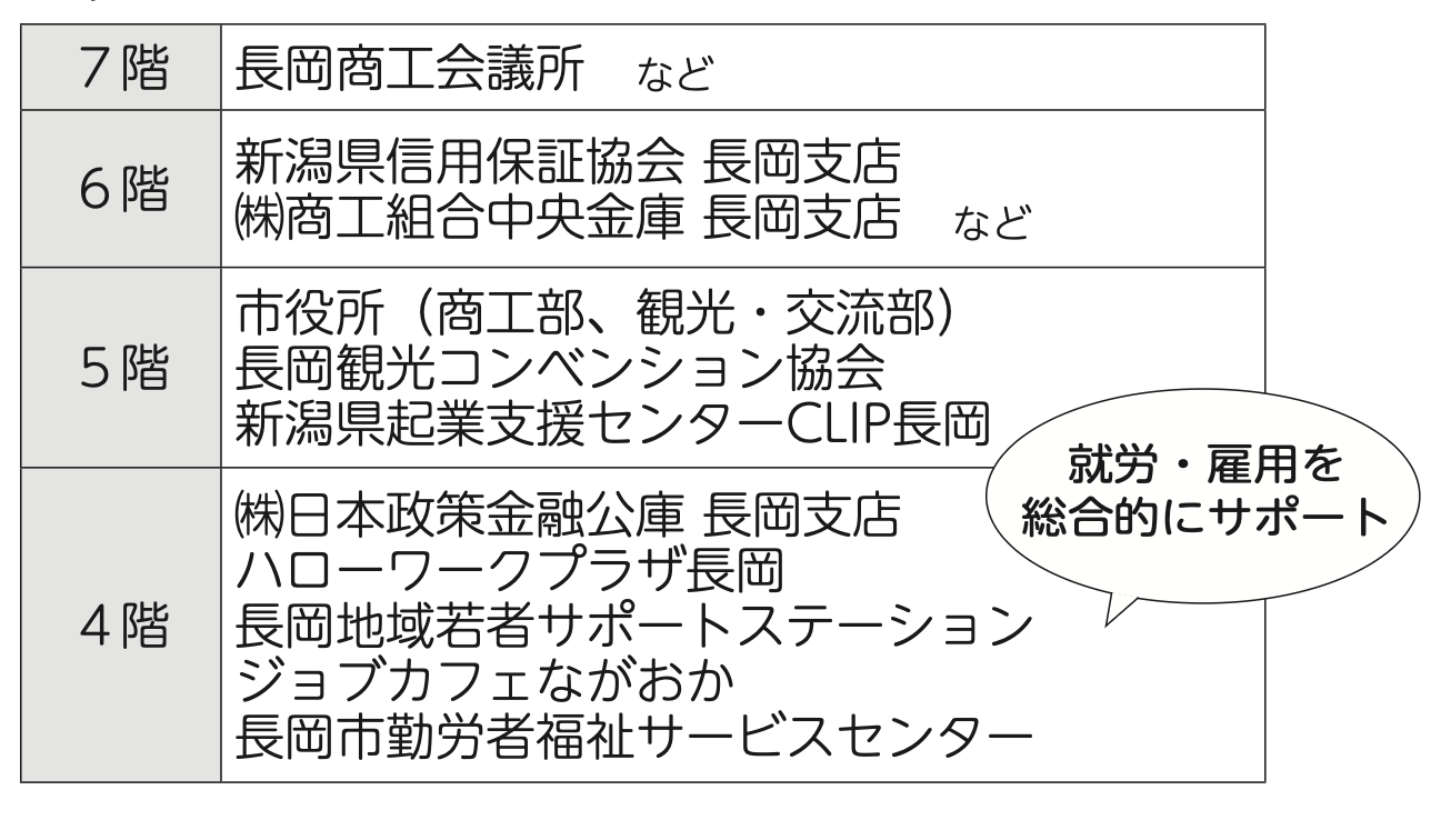 東館には産業支援機関や市の商工・観光部門が集積。産業ビジネス支援拠点として各機関の連携を強化し、市内企業への多面的な支援を展開します。