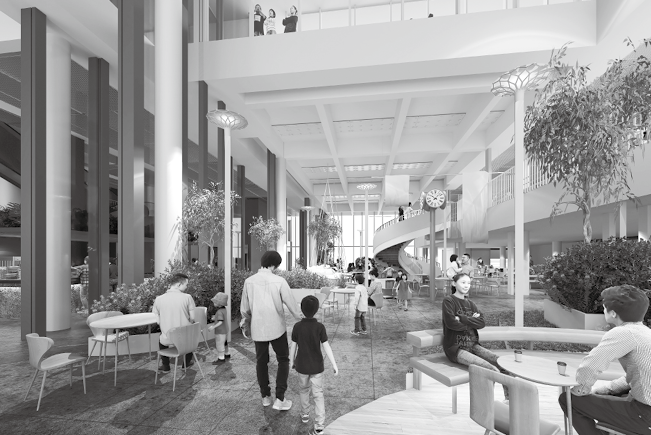 「互尊文庫」がある西館3階と東館をつなぐ公園のような空間「ミライエガーデン」