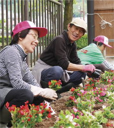 栃尾地域の住民がまちづくりの一環で植栽活動を行いました。話に花を咲かせながら、きれいな花壇を完成させました。(5月12日)
