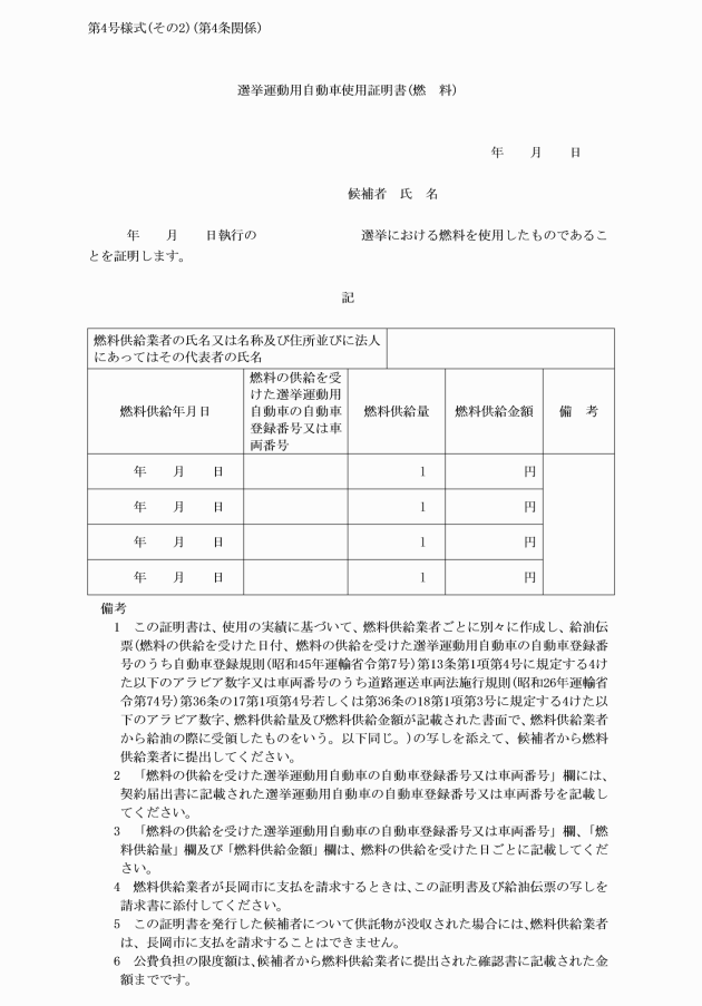 第4条 候補者は、選挙運動用自動車使用証明書、ビラ作成証明書又はポスター作成証明書を、使用又は作成の実績に基づき作成し、条例第3条に規定する有償契約を締結した一般乗用旅客自動車運送事業を経営する者その他の者、ビラ作成業者又はポスター作成業者(以下「契約業者等」という。)に提出しなければならない。