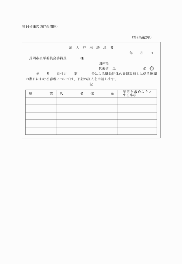 2 職員団体は、必要があると認める場合には、聴聞の期日における審理にその指定する証人を出席させるため、公平委員会に別記第14号様式により請求することができる。