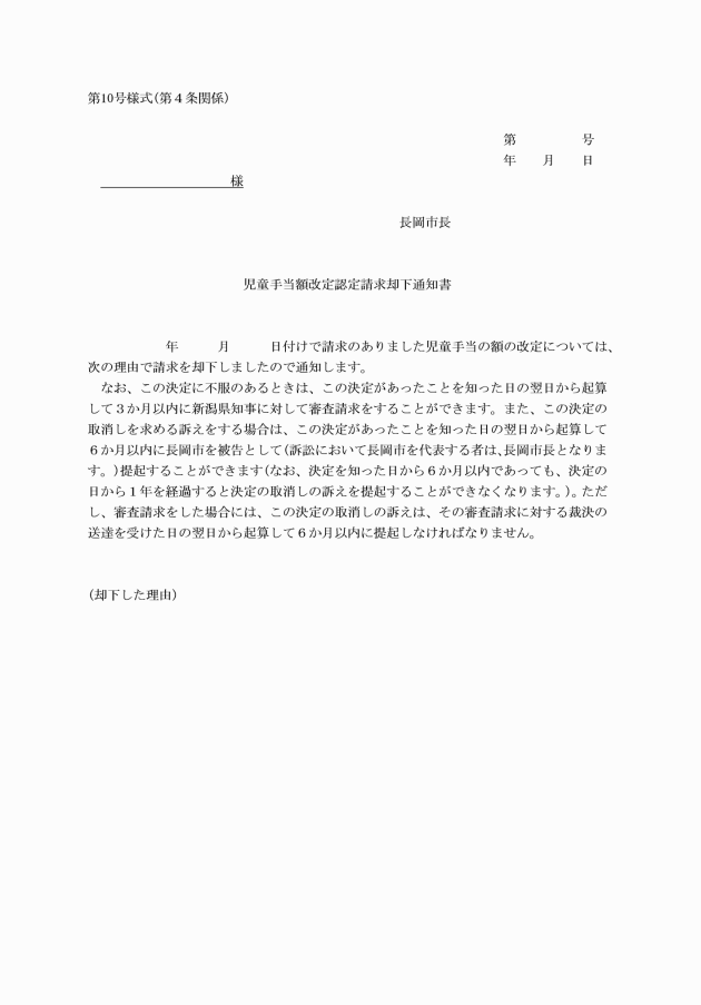 (4) 額改定認定請求書の審査をした結果、児童手当の額を改定しないものと確認したとき。 児童手当額改定認定請求却下通知書