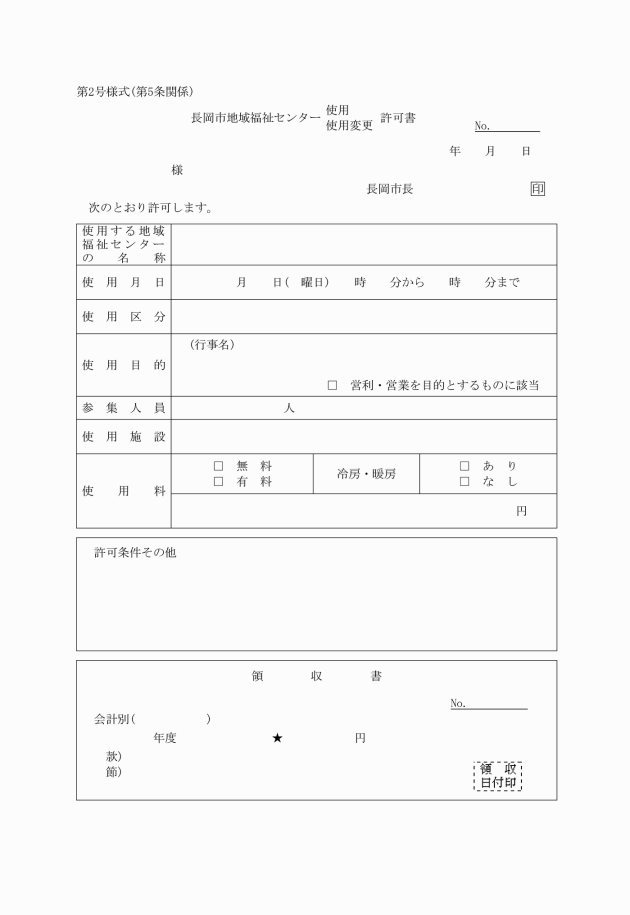 2 改正後の別記第1号様式から別記第4号様式までの規定にかかわらず、当分の間、長岡市社会福祉センター、長岡市サンパルコなかのしま、長岡市越路総合福祉センター及び長岡市山古志地域福祉センターなごみ苑の使用の許可又は変更の許可に係る申込及び通知並びに使用料の減額又は免除に係る申請及び通知は、編入前の中之島町、越路町又は山古志村で定めていた様式を取り繕って用いることができる。