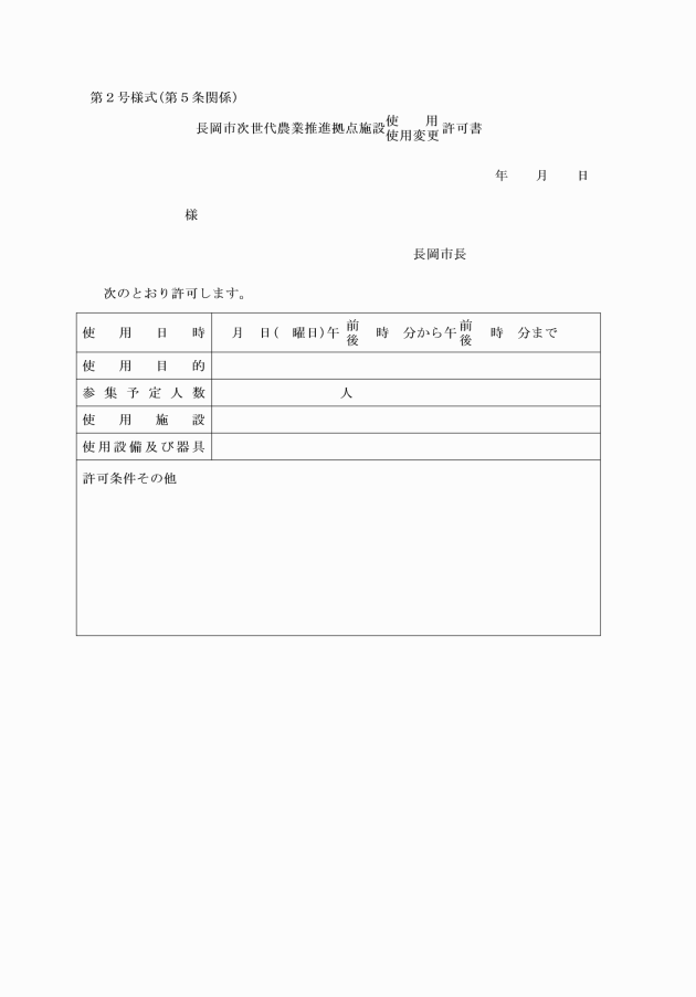 第1条 この規則は、長岡市次世代農業推進拠点施設条例(令和5年長岡市条例第28号。以下「条例」という。)第14条の規定に基づき、長岡市次世代農業推進拠点施設(以下「拠点施設」という。)の管理運営について必要な事項を定めることを目的とする。