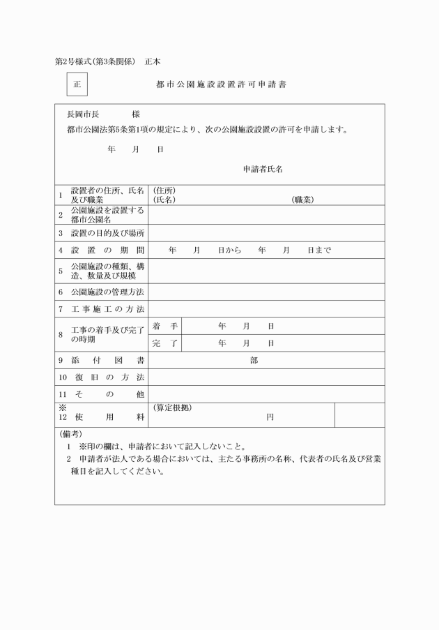 2 法第6条第1項の規定による公園の占用の許可を受ける者に係る申請書の様式は、別記第4号様式による正本及び副本とする。