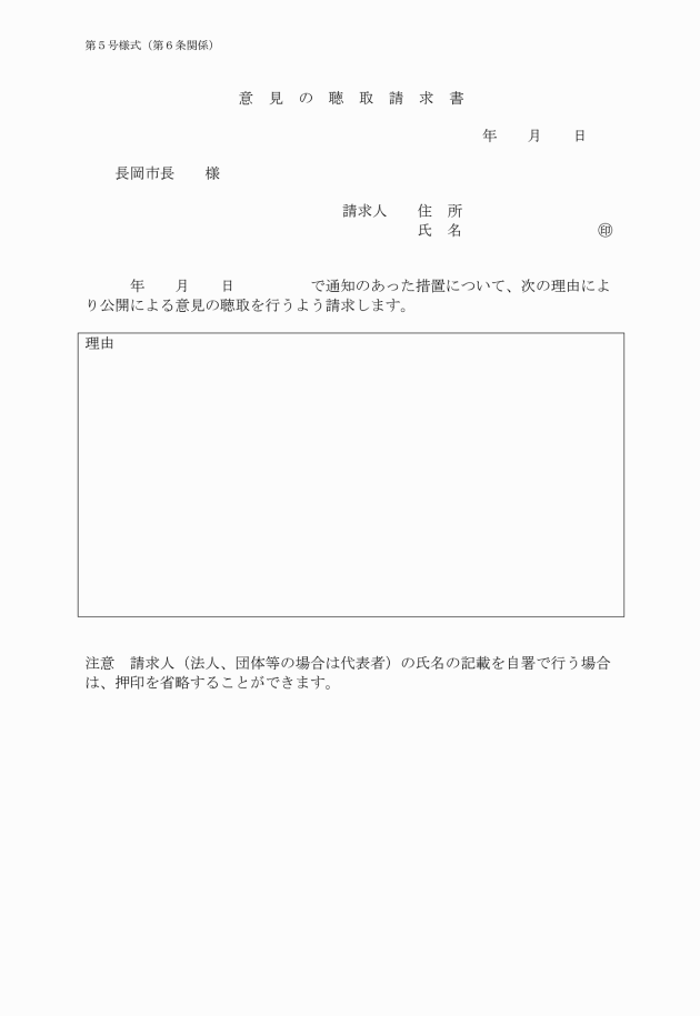 第6条 法第9条第3項又は同条第8項の規定により、公開による意見の聴取の請求をしようとする者は、意見の聴取請求書(別記第5号様式)を市長に提出しなければならない。