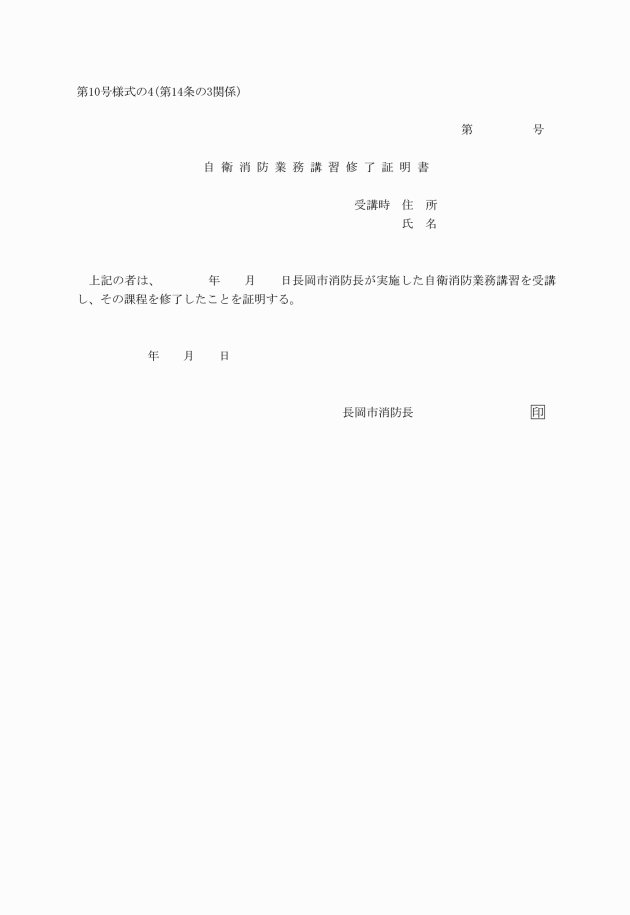 第14条の3 法施行規則第4条の2の14第4項の規定により自衛消防業務講習修了証の交付を受けた者が修了証を紛失し、又は滅失したときは、自衛消防業務講習修了証明申請書(別記第10号様式の3)を提出して、証明書の交付を受けるものとする。