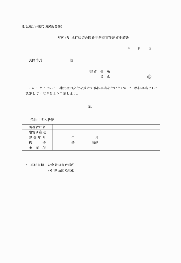 第6条 補助金の交付を受けて、移転事業を行おうとする者は、当該移転事業を実施する前に、がけ地近接等危険住宅移転事業認定申請書(別記第1号様式)により、移転事業としての認定を市長に申請しなければならない。