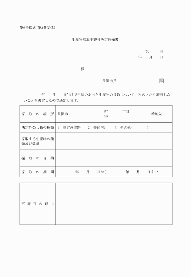 第3条 条例第5条第1項第3号に定める行為(以下この条において「採取」という。)に係る許可を受けようとする者は、生産物採取許可申請書(別記第4号様式)に次に掲げる書類を添えて、市長に提出しなければならない。