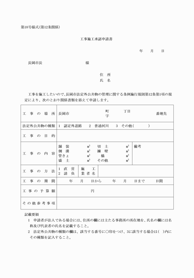 第2条 条例第5条第1項第1号及び第2号に定める行為(以下この条において「使用」という。)に係る許可を受けようとする者は、法定外公共物使用許可申請書(別記第1号様式)に次に掲げる書類を添えて、市長に提出しなければならない。