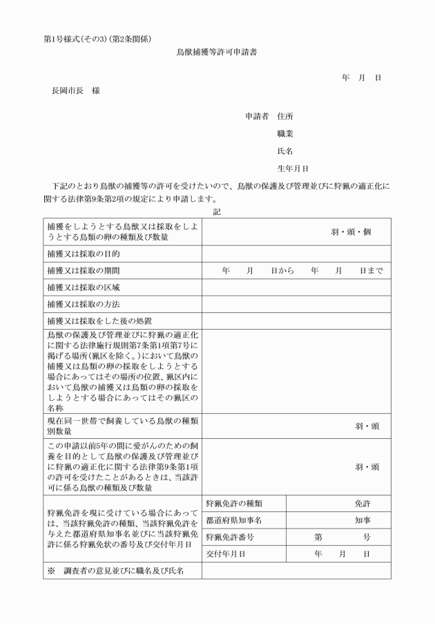 第2条 省令第7条第1項の規定による申請書は、鳥獣捕獲等許可申請書(別記第1号様式)によるものとする。