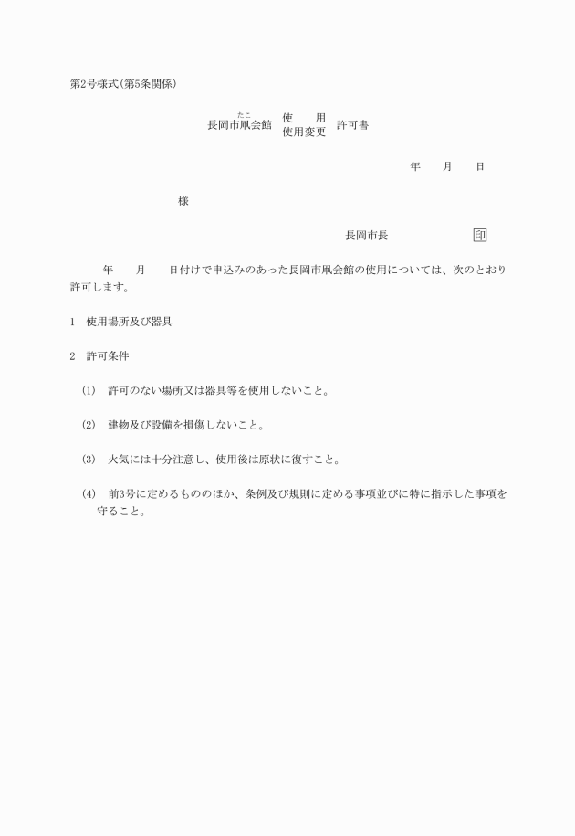 第1条 この規則は、長岡市凧会館条例(平成17年長岡市条例第112号。以下「条例」という。)第12条の規定に基づき、長岡市凧会館(以下「会館」という。)の管理運営に関し、必要な事項を定めることを目的とする。