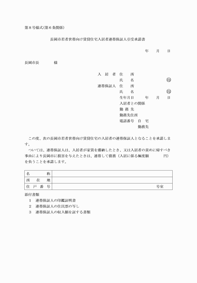 2 前項の連帯保証人引受承諾書には、連帯保証人の印鑑証明書、住民票の写し及び収入額を証する書類を添付しなければならない。