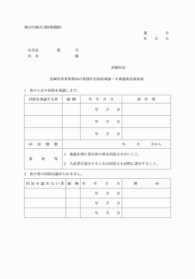 第8条 入居者は、出生、死亡又は転出による異動が生じたときは、速やかに長岡市若者世帯向け賃貸住宅入居者異動届(別記第12号様式)に異動を証する書類を添えて市長に提出しなければならない。