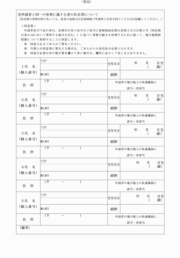 (ウ) 当該対象者の前々年(1月から7月までの間に申請する場合には、3年前の年)の所得の額並びに加算対象扶養親族及び生計維持児童の有無及び数、老人扶養親族及び特定扶養親族の有無及び数についての市町村長の証明書(同法に規定する控除対象扶養親族(19歳未満の者に限る)がある者にあっては、当該控除対象扶養親族の数を明らかにすることができる書類(別紙参考様式2の16歳以上19歳未満の控除対象扶養親族に関する申立書)及び当該控除対象扶養親族の前々年の所得の額についての市町村長の証明書を含む。)