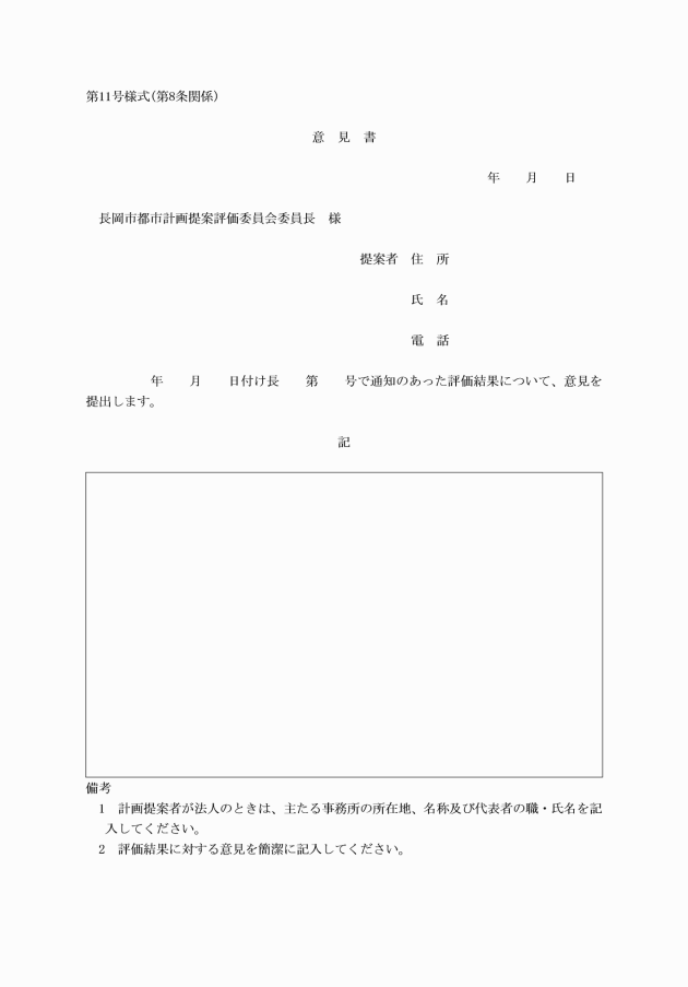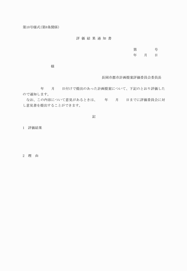 第8条 評価委員会は、計画提案を踏まえた都市計画の決定又は変更をする必要がないと評価したとき、又は計画提案を踏まえた都市計画(当該計画提案に係る都市計画の素案の内容の一部を実現するものに限る。)の決定又は変更をする必要があると評価したときは、その旨及びその理由を評価結果通知書(別記第10号様式)により当該計画提案を行った者に通知するものとする。