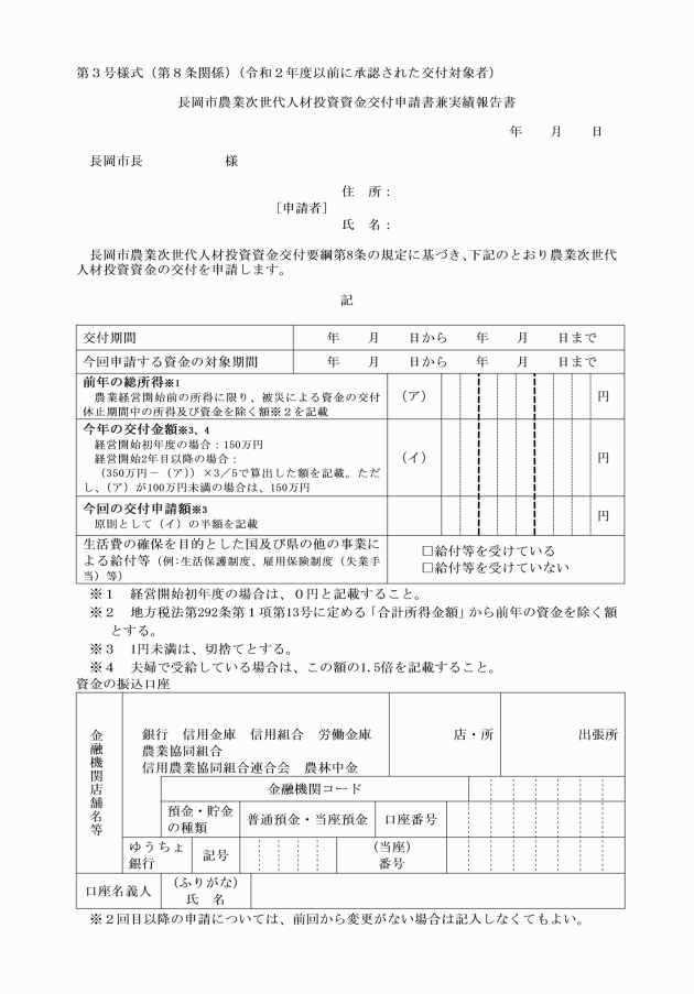 2 支援金の交付を希望する者は、経営発展支援金交付申請書(別記第10号様式)により、市長に申請するものとし、支援金交付申請書の提出は、経営開始型の経営開始4年目の交付対象期間に行う。