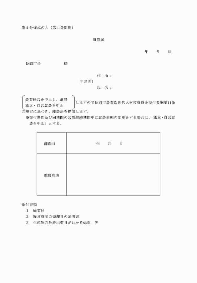 3 交付対象者は、交付期間終了後5年間に農業経営を中止し、離農した場合は、離農後1か月以内に離農届(別記第4号様式の3)を市長に提出するものとする。