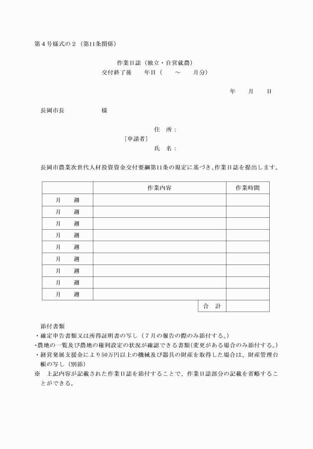 第11条 資金の交付を受けた者(以下「交付対象者」という。)は、資金の交付期間中、毎年7月末日及び1月末日までにその直前の6箇月の就農状況について、就農状況報告書(別記第4号様式)に別に定める書類を添えて、市長に報告しなければならならない。