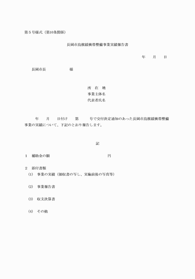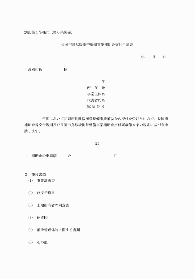 第6条 補助金の交付を受けようとする者(以下「申請者」という。)は、長岡市鳥獣緩衝帯整備事業補助金交付申請書(別記第1号様式)を市長に提出しなければならない。