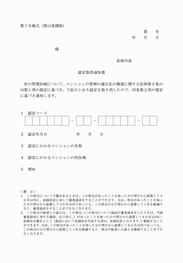第12条 市長は、法第5条の10第1項の規定により認定を取り消したときは、速やかに認定取消通知書(別記第7号様式)により、当該認定管理者等であった者に通知するものとする。