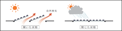 - 太陽光…屋根に可動式の太陽光発電パネルを設置。発電(10kW)と屋根の開閉で換気を行う