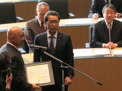市は、長岡とホノルル両市の友好の架け橋としてご尽力をいただいているハワイ日米協会名誉会長のエドウィン・ホーキンスさんに国際親善名誉市民証を贈呈しました。